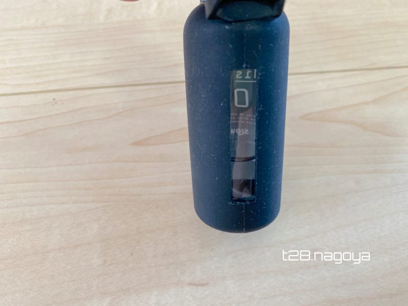 傾けると、キャップの落下防止ゴムがズルズルと上に上がってきて、抜けそうになります。